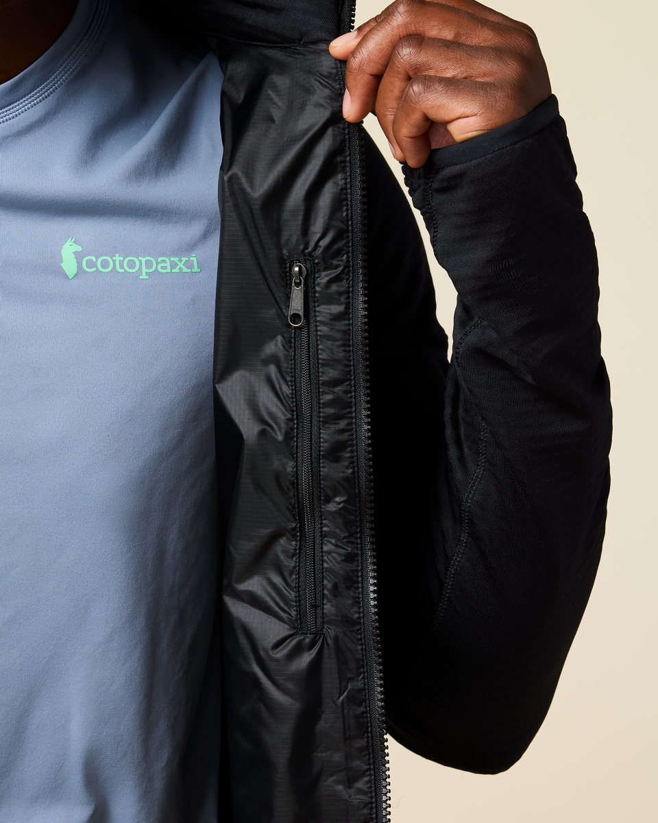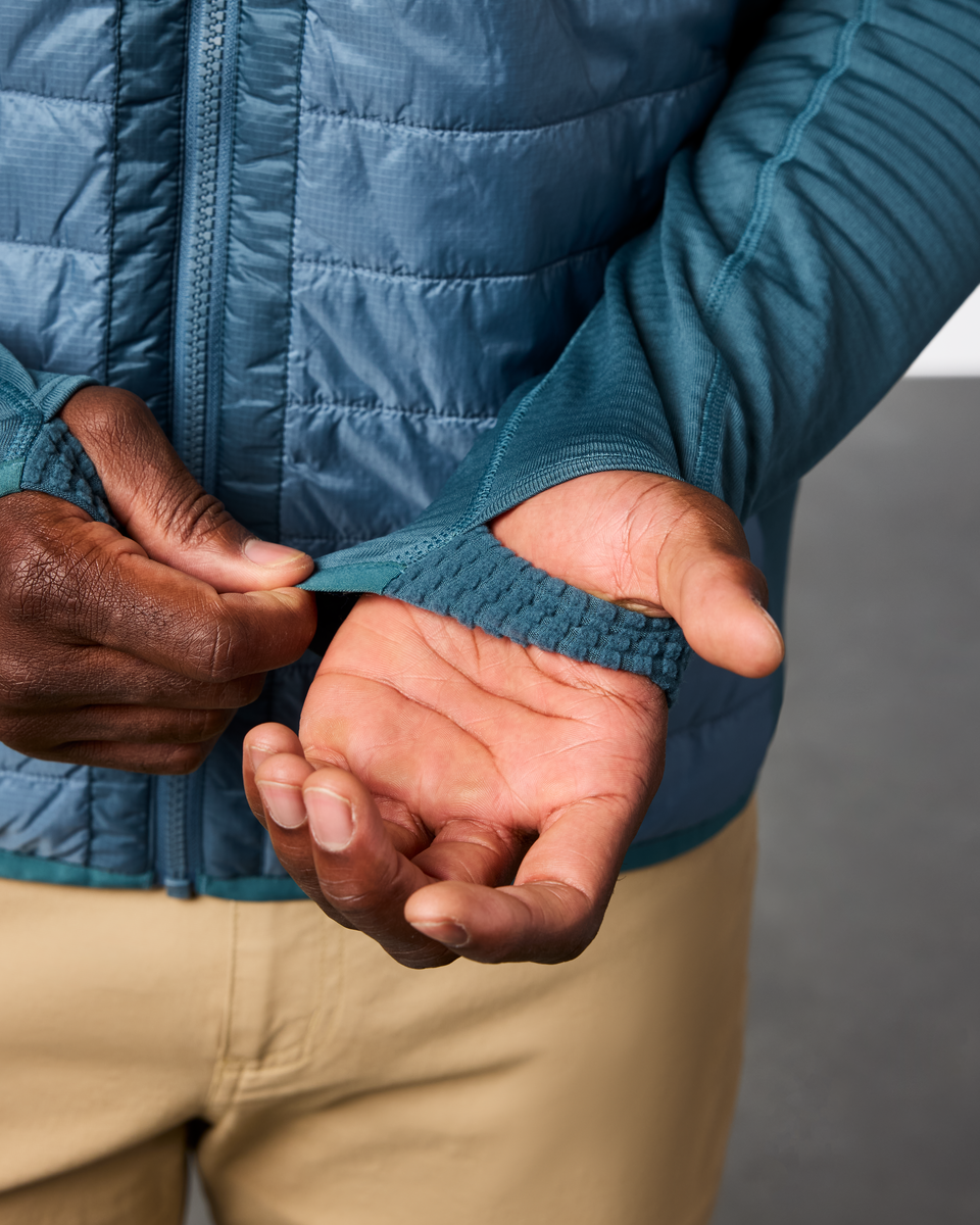This jacket simplifies layering during brisk adventures. Its synthetic PrimaLoft Gold P.U.R.E. (Produced Using Reduced Emissions) Insulation helps regulate your temperature, while stretch paneling in the sleeves and knit side panels make quick movements easy.