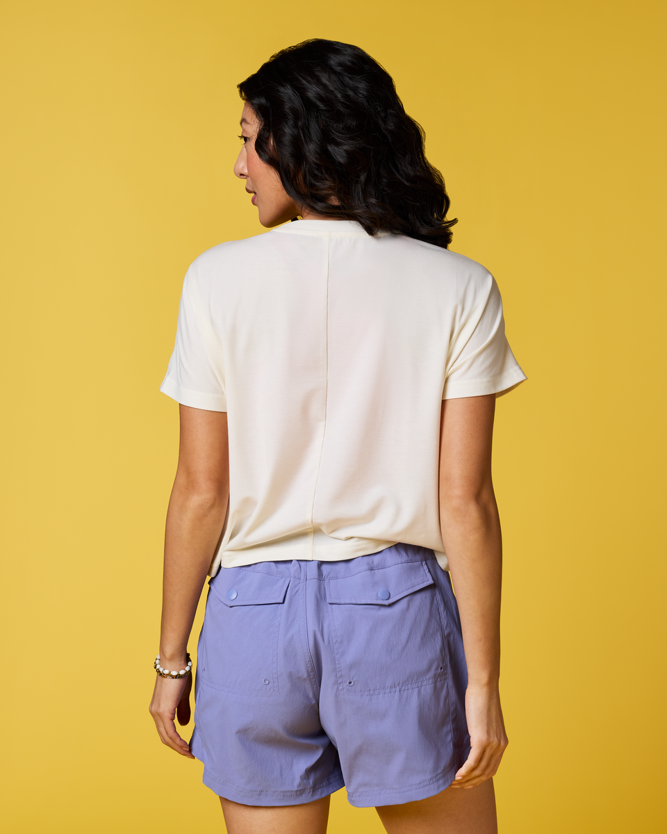 Scramble up high or stick your toes in the sand the Empaca Crop T Shirt is an adventure must have. A stretchy and soft blend of recycled polyester, TENCEL, and spandex makes this the ultimate companion for desert hikes or sunset cragging, and the cropped design pairs perfectly with high waisted tights and denim cut offs.