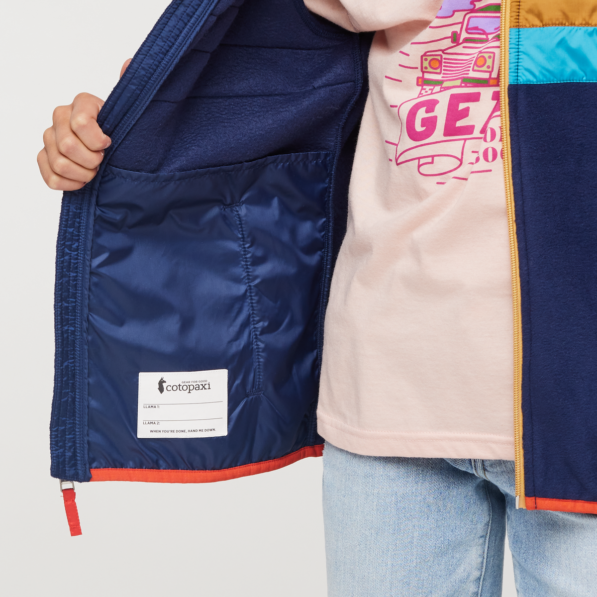 The Kids’ Teca Fleece is great as a stand alone jacket or midlayer on any adventure. Each fleece is made from best in class, recycled fleece and repurposed polyester taffeta that might otherwise end up in the landfill. This style is unisex.