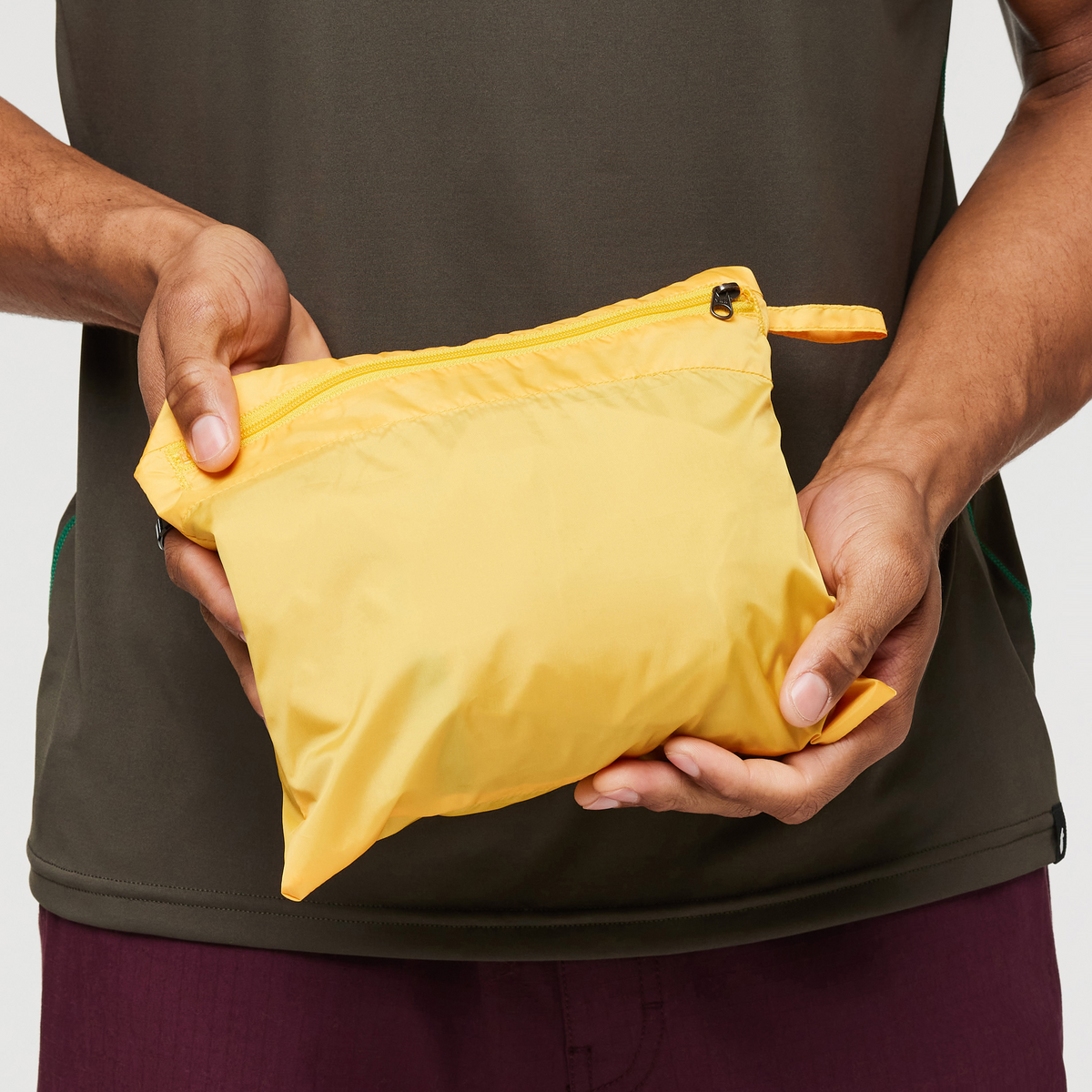 Packs into front zippered pocket