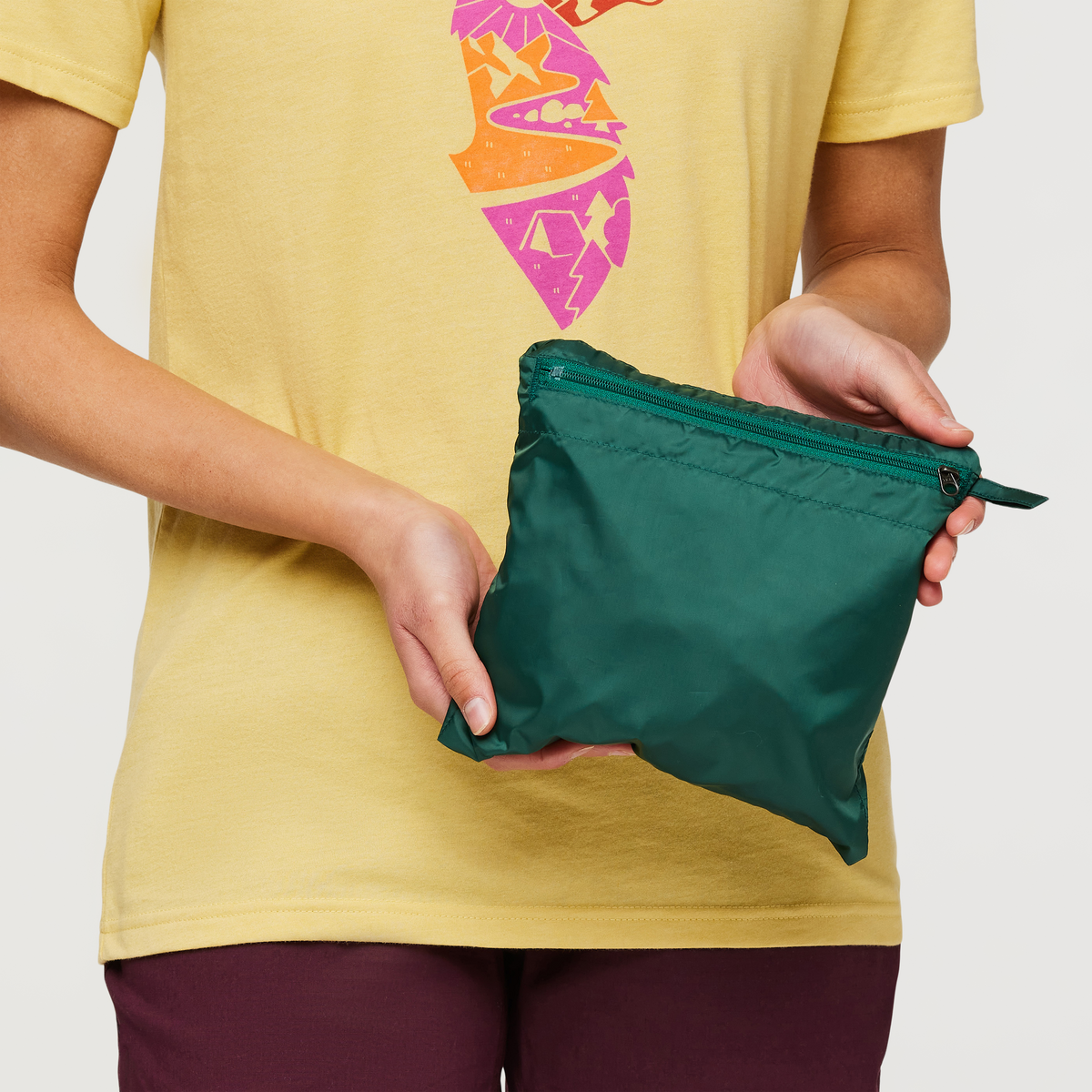 Packs into front zippered pocket